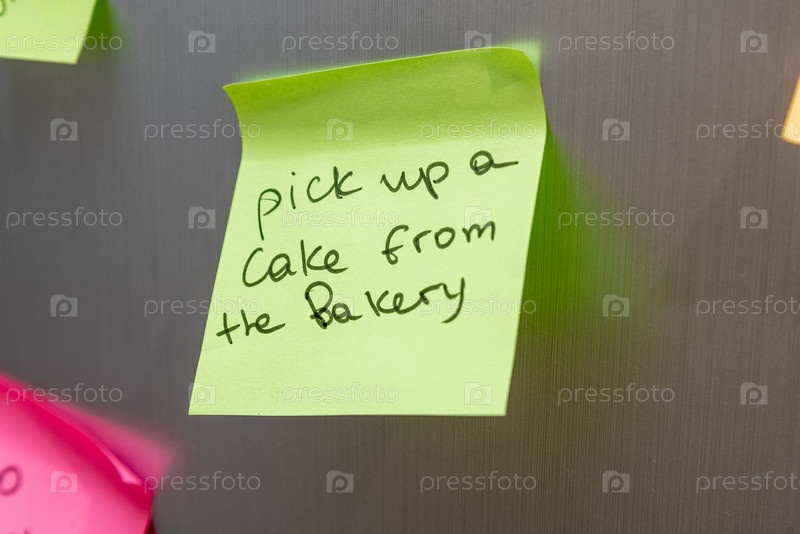 Наклейка напоминания, приклеенная к двери холодильника, чтобы забрать пирог из пекарни