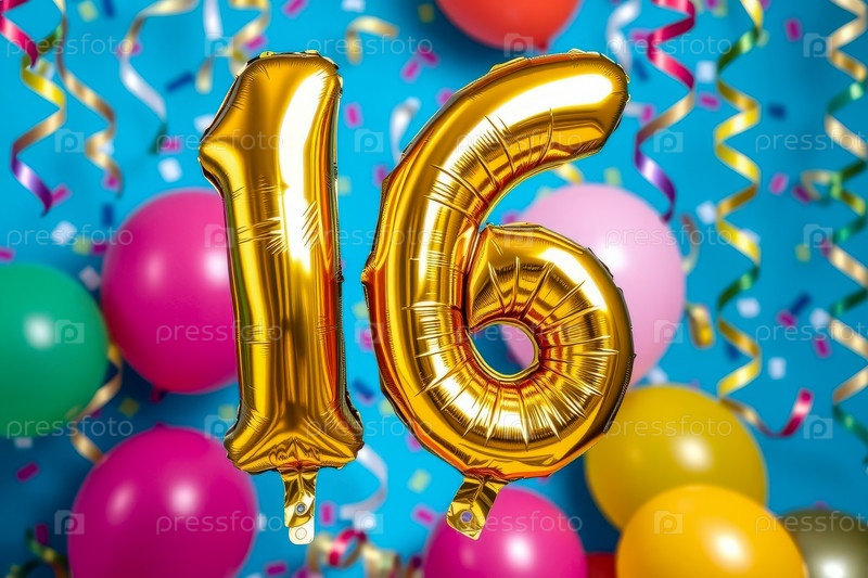 Гелиевый день рождения шарик формы номер шестнадцать, золотые буквы фигура 16 праздник праздничный фон