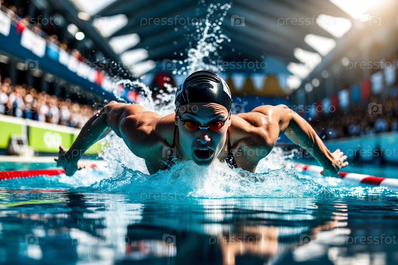 AI Generative Женщина спортсменка пловчик плавание скоростная гонка в бассейне, летние Олимпийские игры соревнования