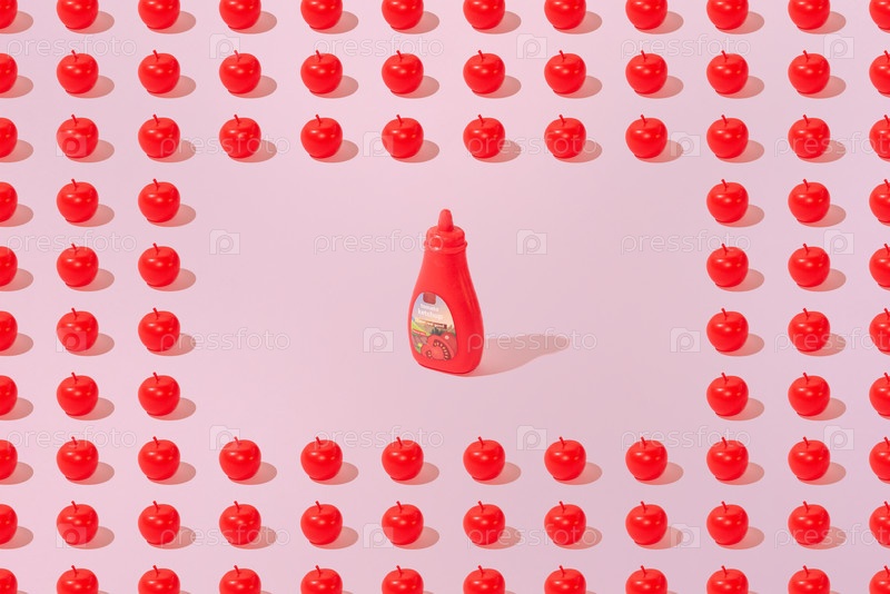 Творческий абстрактный летний образ яблока и кетчупа плоский лежит на пастельно-розовом фоне минимализма