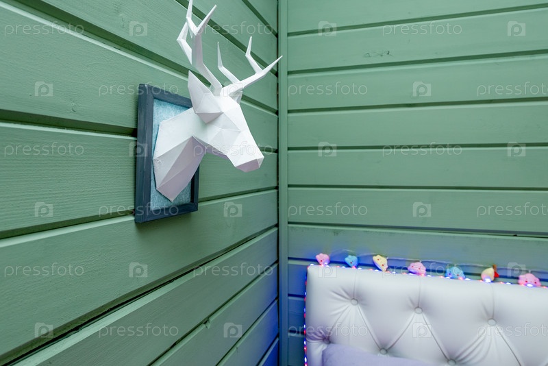 Декоративные рога оленей, висящие на стене в гостиной или спальне
