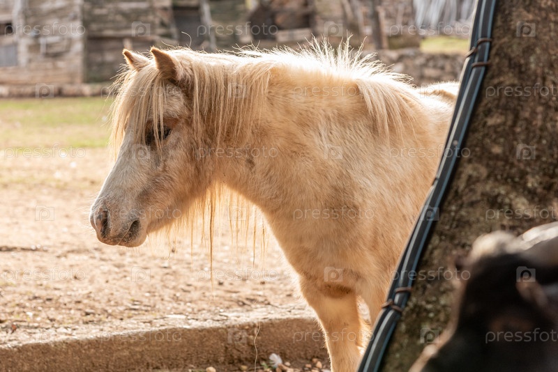 Домашняя лошадь пасется на луговой траве, ферма с животными ландшафт на открытом воздухе