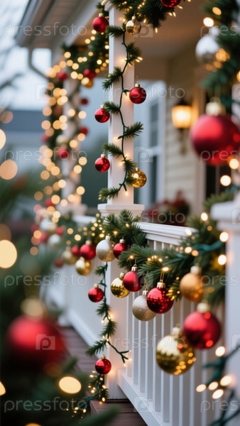 Красочные рождественские шары грациозно висят на террасе, усиленные мерцающими огнями и пышной зеленой средой.Сцена излучает тепло и радость в мирный день Генеративная AI