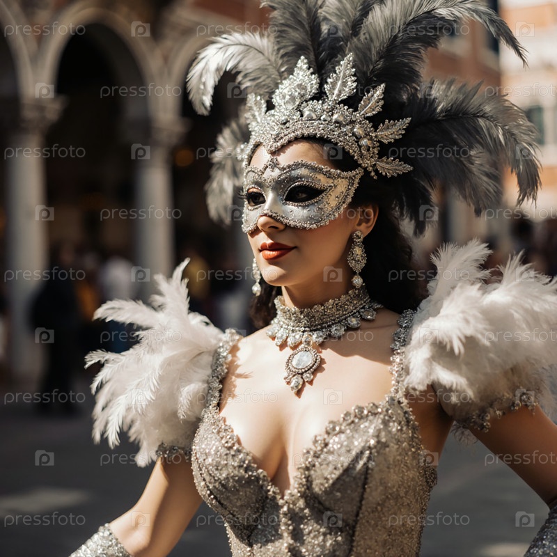 Женщина, украшенная блестящим нарядом и сложной маской гуляет по оживленным улицам Венецианского карнавала, излучая элегантность и тайну в праздничной атмосфере Generative AI