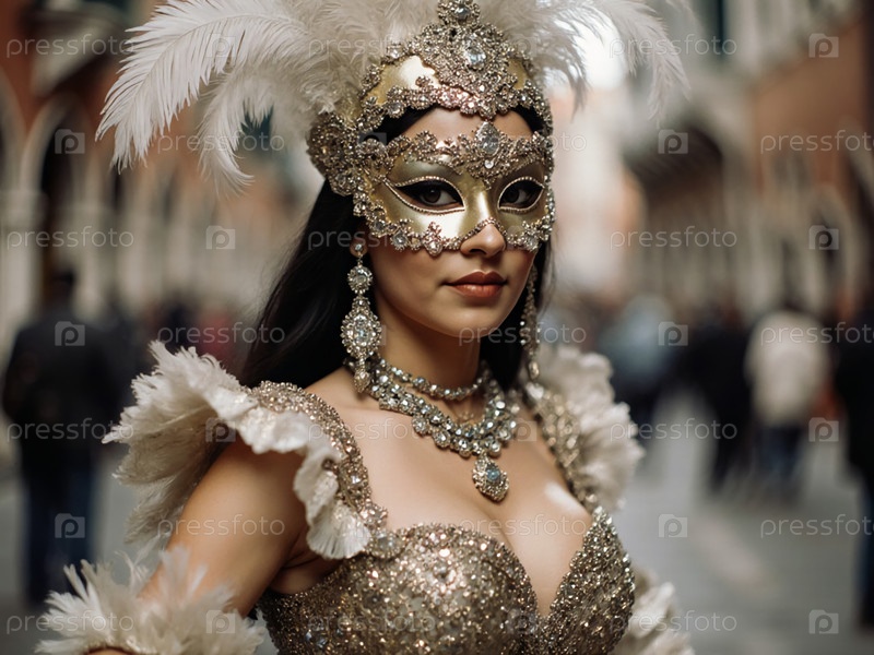 Потрясающая женщина грациозно носит украшенную золотую маску, украшенную перьями и драгоценностями во время оживленного Венецианского карнавала