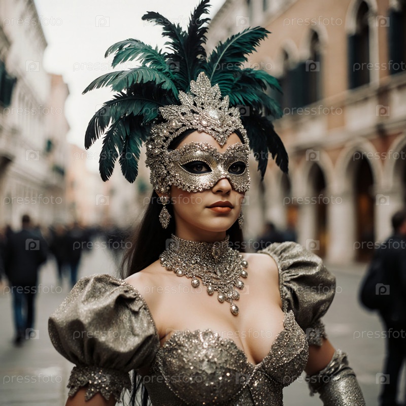 Одетая в красивое блестящее платье и сложную маску, женщина воплощает дух Венецианского карнавала Generative AI