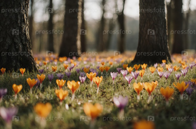 Вибрирующие оранжевые и фиолетовые цветы крокуса обильно цветут на лесном полу, создавая потрясающий ковер цвета под высокими деревьями в нежном солнечном свете Generative AI