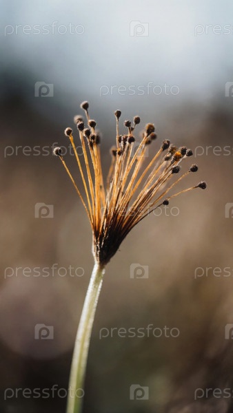 В мягком свете рассвета стройный стебель дикого цветка стоит высоко, его хрупкие семена расположены на вершине как крошечные танцоры