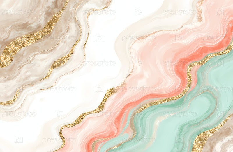 Нежные волны пастельных цветов переплетаются друг с другом, демонстрируя оттенки розового, мятного и сливочного цвета, украшенные блестящими акцентами. спокойный момент захватывает красоту в абстрактном искусстве генеративная AI