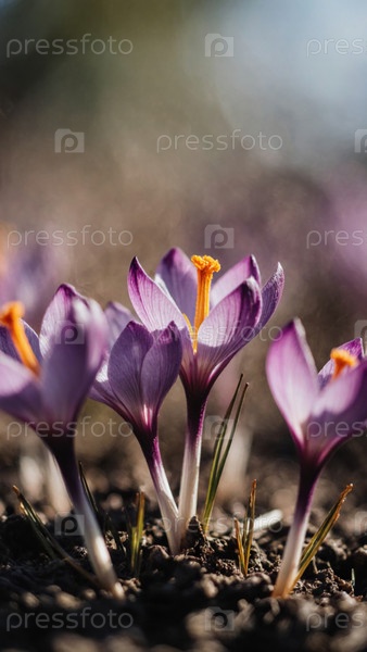 Под мягким солнечным светом кластеры фиолетовых цветов крокуса поднимаются из темной земли, их листья широко раскрываются для приветствия тепла и красоты нового сезона Generative AI