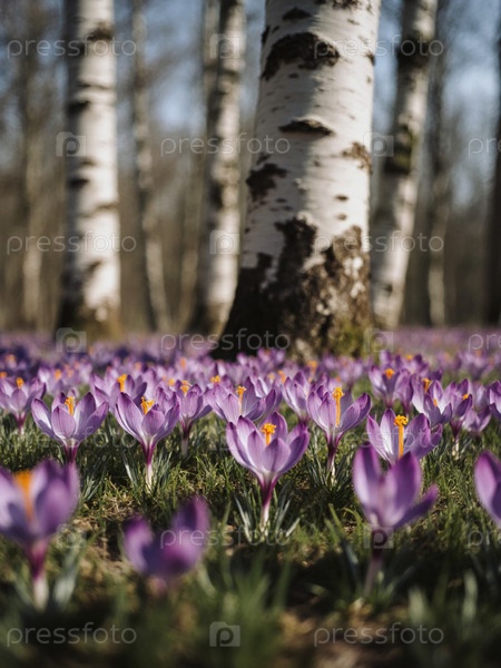Спокойная сцена разворачивается, когда скопления фиолетовых крокусов растягивают свои лепестки к солнцу, покрывая лесной пол грациозными березами
