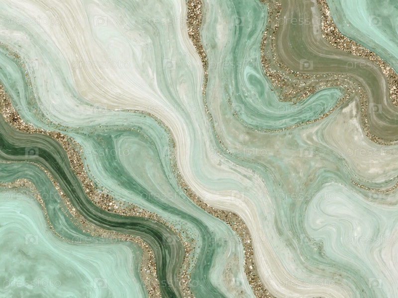 Мягкие волны зеленых, бежевых и золотых тонов плавно смешиваются между собой, создавая увлекательное абстрактное произведение искусства, которое вызывает спокойствие и творчество