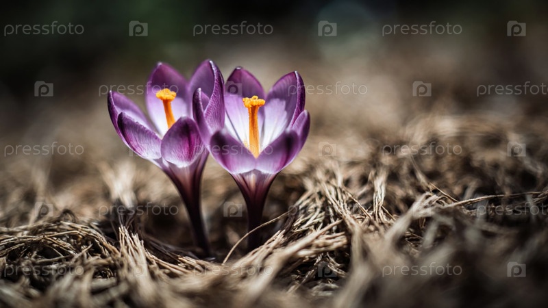 Ярко-фиолетовые крокусы поднимаются из темной земли, купаясь в золотистом солнечном свете. их листья грациозно раскрываются, сигнализируя о тепле и обновлении весны Generative AI