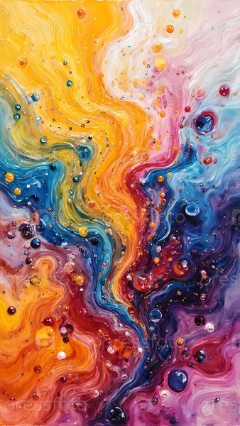 Динамическое отображение цвета вспыхивает, вращая вместе оттенки желтого, розового, синего и оранжевого.Мелкие бусы света танцуют среди пигментов, создавая космическое зрелище Генеративный ИИ