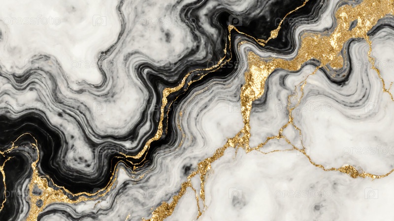 Вихри черного, белого и серого плавно смешиваются с золотыми акцентами, создавая увлекательное произведение искусства, которое захватывает глаз своим динамическим потоком Generative AI