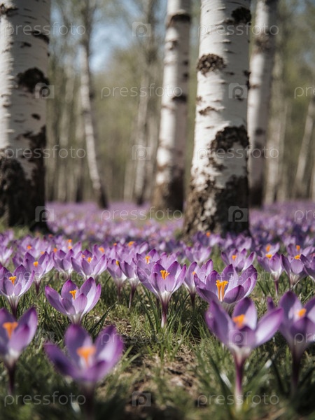 Красочный ковер из фиолетовых цветов крокуса простирается по земле, их яркие листья контрастируют с белыми березами в тихом весеннем лесу Generative AI