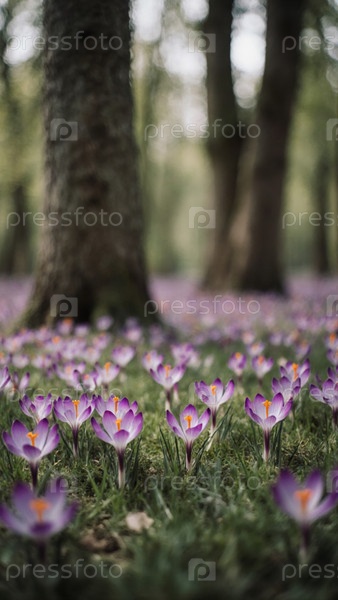 В мирном лесу тонкие фиолетовые крокусы тянутся к солнечному свету, создавая красочный ковер на земле среди высоких деревьев