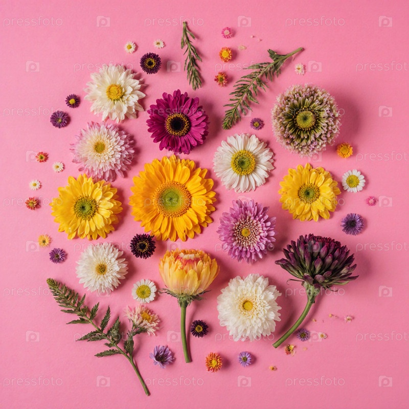 Яркие цветы астера, гербер и хризантемы расположены в ярком круге на мягком розовом фоне, излучая тепло и радость под естественным светом Generative AI