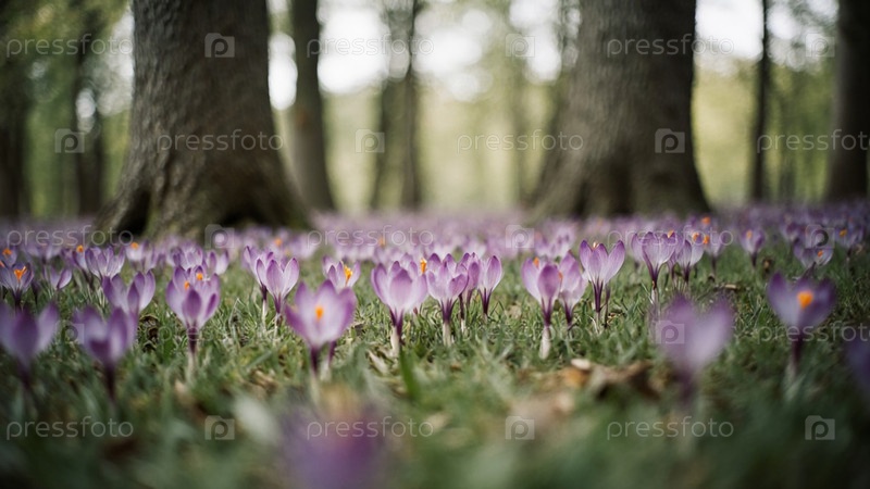 Потрясающий дисплей фиолетовых цветов крокусов покрывает землю, процветая под нежной тенью величественных деревьев, создавая спокойную весеннюю сцену, наполненную красотой и жизнью Generative AI