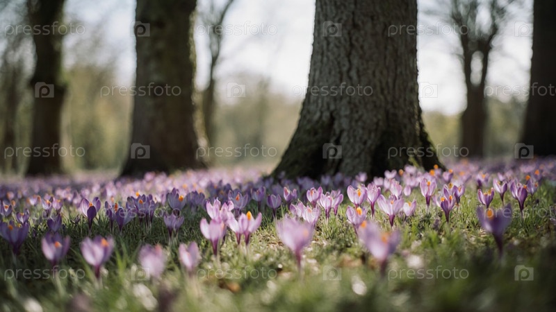 Мягкий солнечный свет фильтрует через деревья, освещая ковер из фиолетовых крокусов, которые цветут в гармонии с природой
