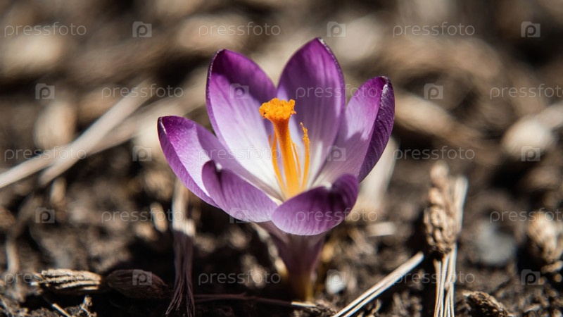 Из темной почвы появляется потрясающий цветок крокуса, демонстрируя яркие фиолетовые листья и ярко-оранжевый центр.Эта деликатная красота символизирует приход тепла и радости весны Generative AI