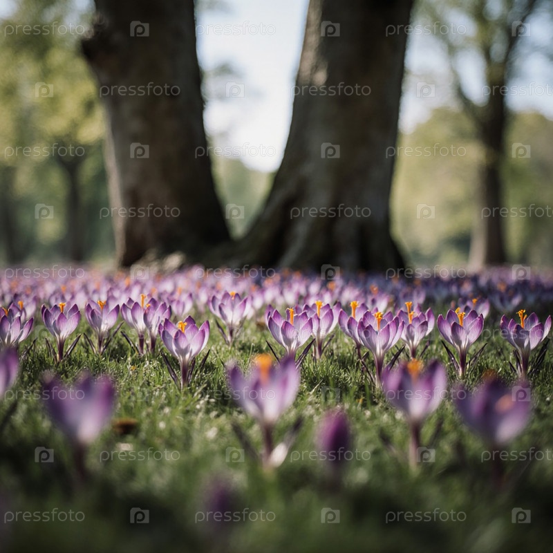 Крокусы вспыхивают цветами под высокими деревьями, создавая потрясающий цветочный ковер Generative AI