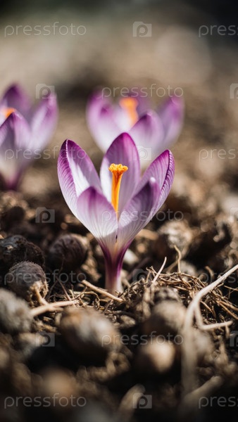 Из почвы выходят ярко-фиолетовые крокусы, их нежные листья подчеркивают свежесть весны