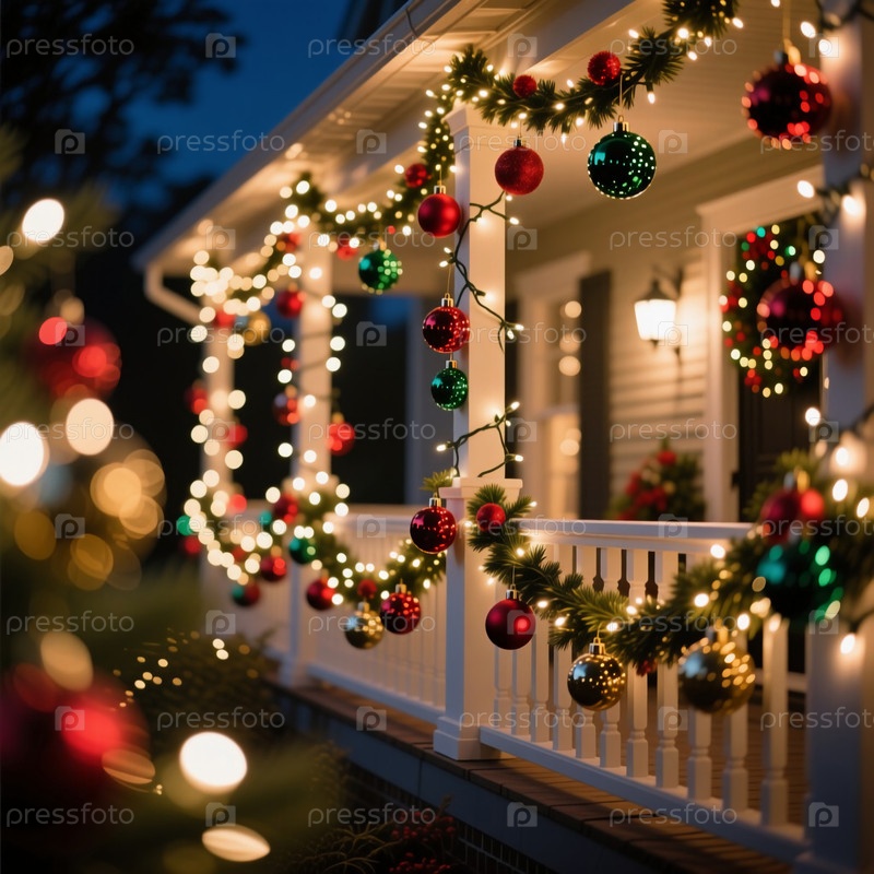 Ярко окрашенные рождественские шары висят на прекрасно оформленной террасе. мерцающие огни улучшают праздничную атмосферу, приглашая радость и тепло в спокойную зимнюю ночь Generative AI