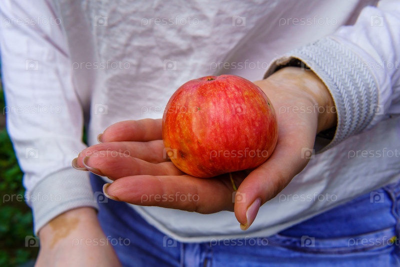 Яблоко сорта "Апорт" женщина держит на руке