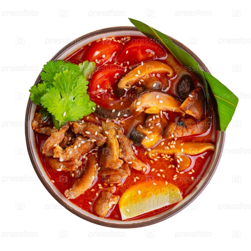 Пикантный азиатский суп с мясом, грибами шиитаке, томатами, кориандром, лаймом и кунжутом в таре изолированной на белом фоне