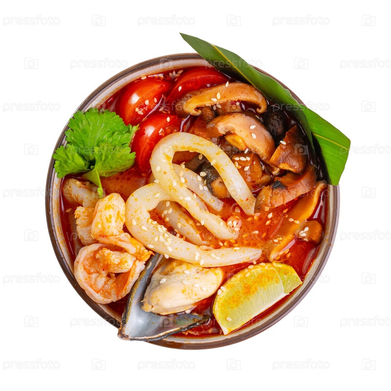 Вид сверху на традиционный острый тайский суп из морепродуктов tom yum goong в керамической тарелке.Практика включает креветки, кальмары, мидии, грибы, помидоры, лаймы, свежие травы и кунжут, изолированные на простом белом фоне