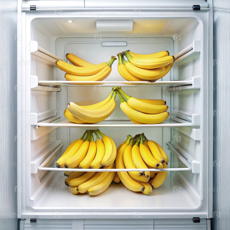 Свежеспелые желтые бананы хранятся в холодильнике