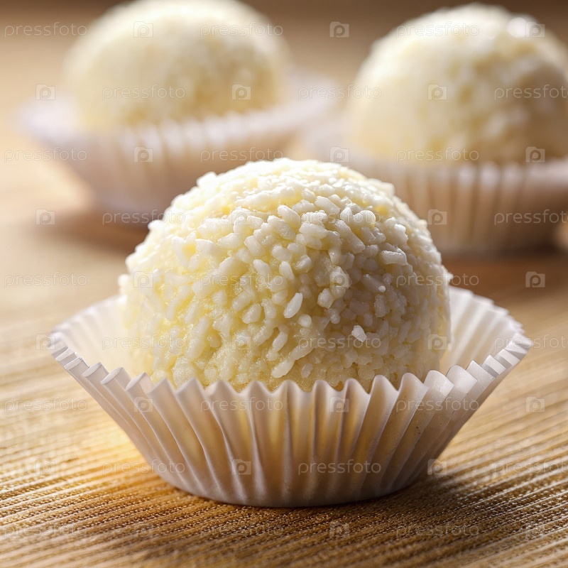 Одинокий белый шоколадный трюфель в бумажной чашке на деревянной поверхности