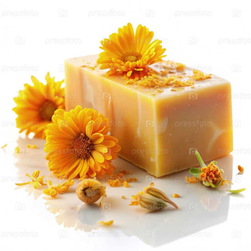 Естественное мыло из календулы с цветочными лепестками на белом фоне