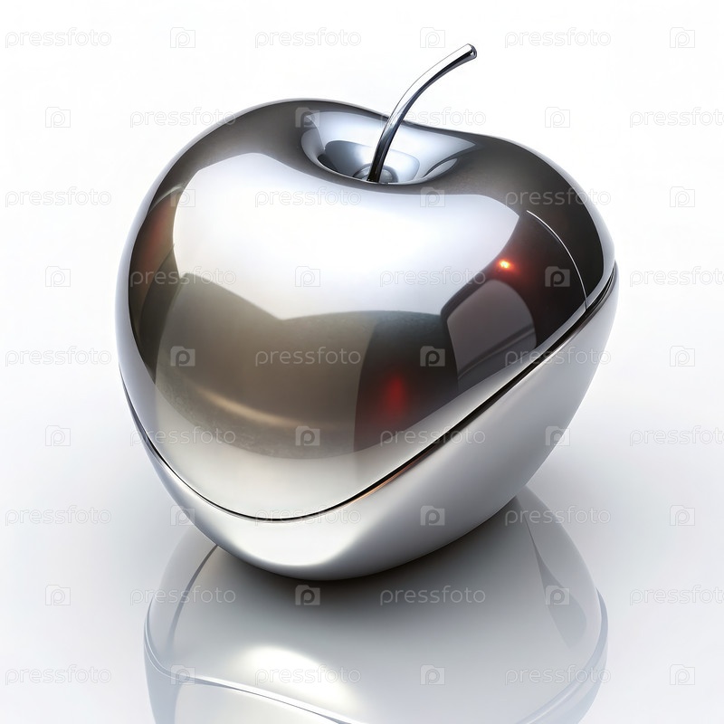 Блестящая серебряная компьютерная мышь в форме яблони на белой поверхности. генеративный ИИ