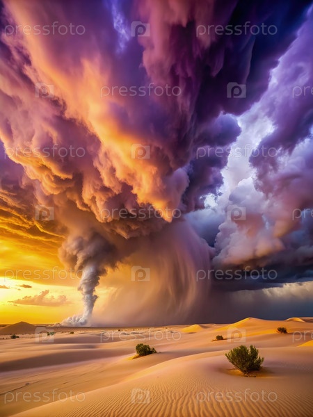 Драматический закат солнца над белыми песчаными дюнами с вращающимся формированием облаков