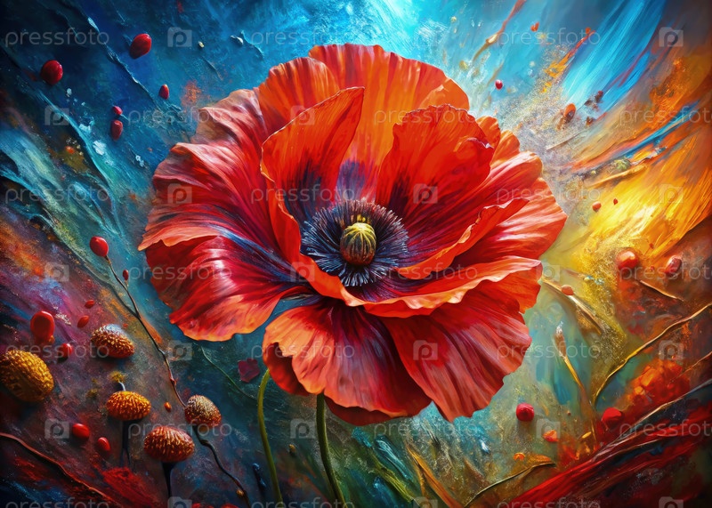 Одинокий красный маковый цветок в полном цветении, нарисованный в гиперреалистическом стиле