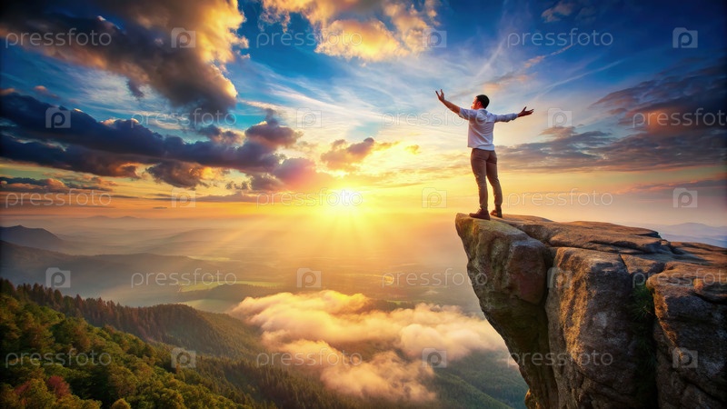Человек стоит на краю скалы при восходе солнца, руки вытянутыми с видом на туманные горы