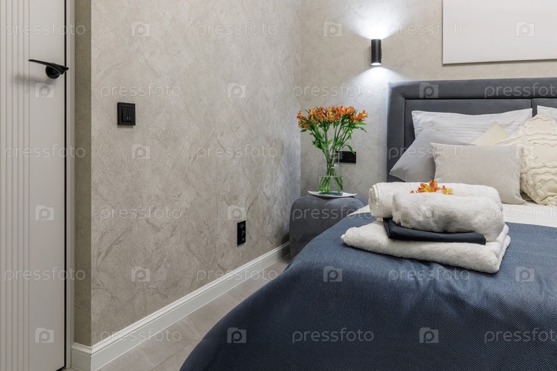 Детальный снимок интерьера современного уголка спальни, в котором представлена серая мягкая кровать с синим текстурированным постельным покрытием и белыми полотенцами на фоне блестящей текстурированной стены с минималистической лампой и оранжевыми цветами