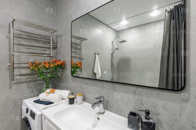 Горизонтальный снимок интерьера современной ванной комнаты.В ней есть белая раковина, стиральная машина с свежими полотенцами и оранжевыми цветами.Большое черное зеркало отражает душную зону на элегантной серой мраморной плитке