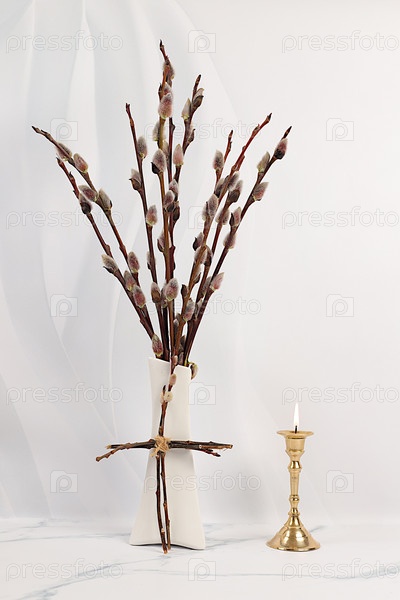 Горящая свеча и молодые цветущие пушистые ветви ивы в вазе на кухонном столе. концепция Пальмового воскресенья, подготовка к празднованию Пасхи, шаблон дизайна с пространством для текста и праздничный пасхальный баннер