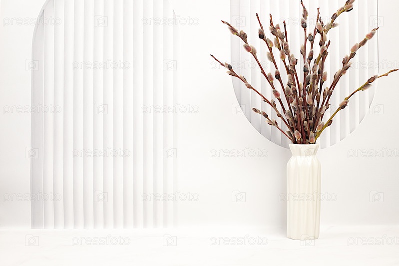 Деликатные ветки ивы в вазе на кухонном столе. концепция Пальмового воскресенья, подготовка к празднованию Пасхи, шаблон дизайна с пространством для текста и праздничного пасхального баннера, домашний интерьерный дизайн