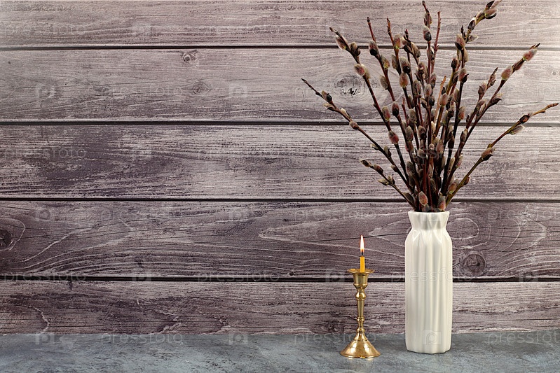 Горящая свеча и молодые цветущие ветви пушистой ивы на старом деревянном столе. концепция Пальмового воскресенья, подготовка к празднованию Пасхи, шаблон дизайна с пространством для текста и пасхального баннера