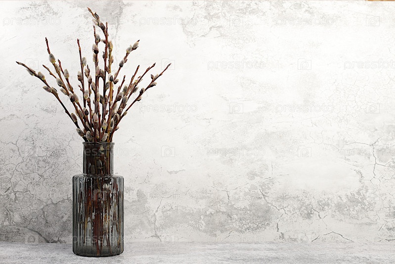 Деликатные ветки ивы в вазе на кухонном столе. концепция Пальмового воскресенья, подготовка к празднованию Пасхи, шаблон дизайна с пространством для текста и праздничного пасхального баннера, домашний интерьерный дизайн, абстрактная весенняя цветовая аран
