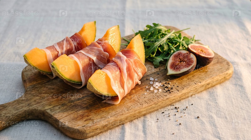 Прошутто и кальсунная дыня на деревянной доске с свежими инжирами