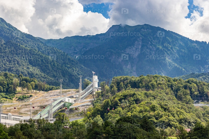 Вид на горы Кавказа и комплекс для прыжков на лыжах с трамплина «Русские горки» в селе Эстосадок. Сочинский национальный парк. Красная Поляна