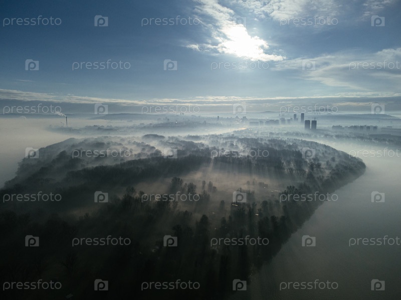 Полет беспилотника над рекой Дунай в смоге и тумане утром.Дистрикт Земун и Новый Белград, Белград, Сербия, Европа