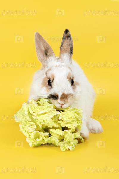 Белый кролик с коричневыми ушами, ест капусту на желтом фоне