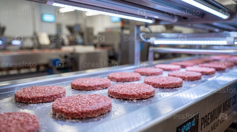 Котлеты для бургеров на ленточном конвейере в цехе по производству мясных полуфабрикатов