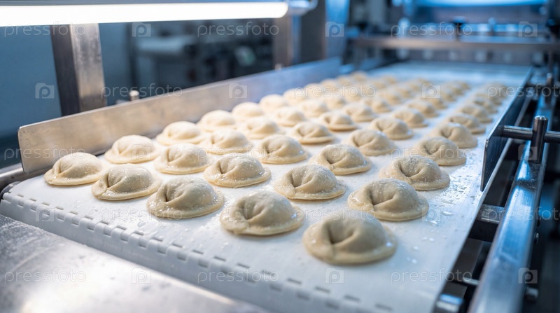 Пельмени ан ленточном конвейере в сортировочном цехе мясокомбината по производству мясных полуфабрикатов